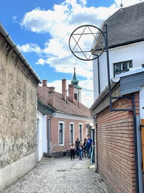 The earliest mention of Jewish people in Szentendre was about 1822, but like almost all of Hungary, that cord was ultimately and fatally cut in 1944 when Hungarian Jews were taken from their homes, moved into ghettos, and ultimately delivered to German death camps, Auschwitz-Birkenau, in particular. Today, the Jewish community, in this small, tourist and artist-centered town, has all but disappeared, save perhaps a dozen or so people. A tiny, mostly symbolic synagogue, with a capacity of about 5 or 6 people, has been created on private property along a quiet lane. When we visited it in the fall, it had recently been vandalized. Vandalization is an apt term to describe much of the Jewish history here in Hungary – the act of deliberately destroying or damaging public or private property.